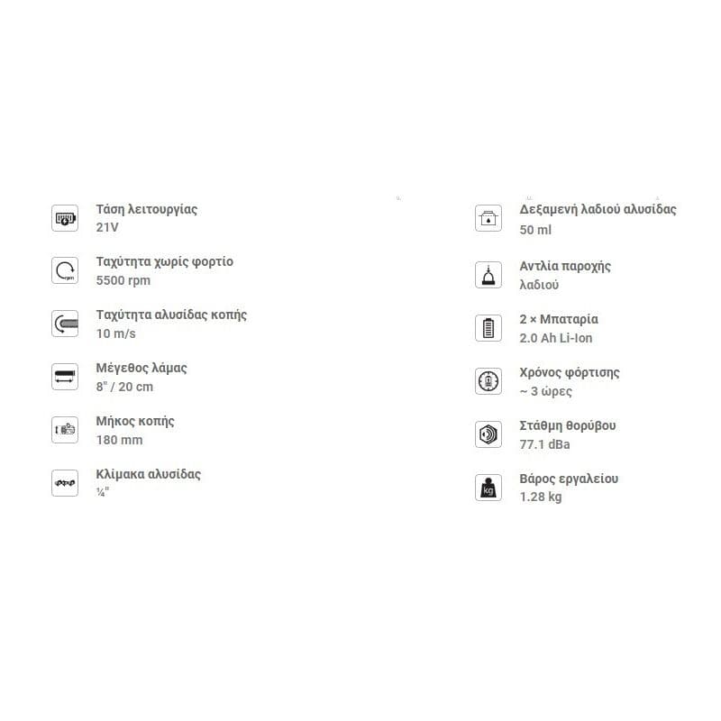Επιπλέον Λεπτομέρειες: Με 2 Mπαταρίες 2.0 Ah Li-Ion