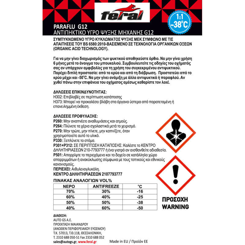 Το αντιψυκτικό G12 Feral είναι ένα προϊόν από συμπυκνωμένο υγρό κυκλώματος ψύξης ΜΕΚ, σύμφωνο με τις απαιτήσεις του BS 6580:2010 και είναι βασισμένο σε τεχνολογία ανόργανων οξέων (Inorganic Acid Technology). Η υψηλή ποιότητα αντιψυκτικού προστατεύει το κύκλωμα ψύξης του αυτοκινήτου όλο τον χρόνο. Παρέχει εξαιρετική προστασία κατά της διάβρωσης, της σκουριάς και της διάρρηξης, ενισχυμένη προστασία αντλίας και σωληνώσεων του συστήματος ψύξεως. Συνιστάται ειδικά για την προστασία των αλουμινένιων ψυγείων των σύγχρονων οχημάτων.