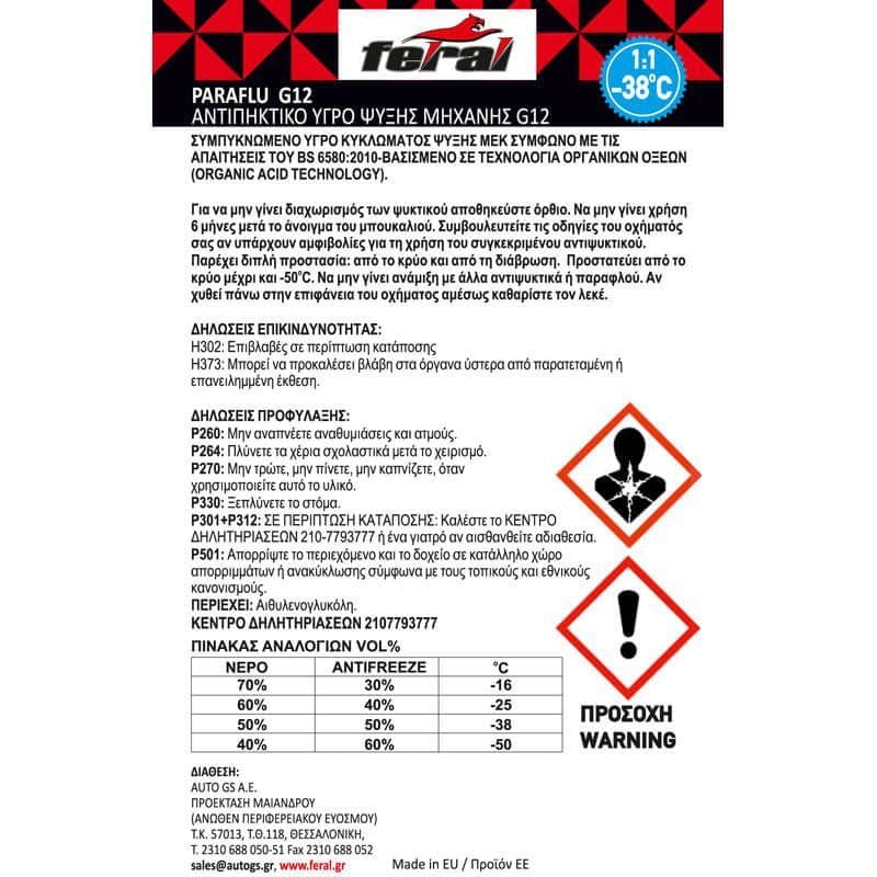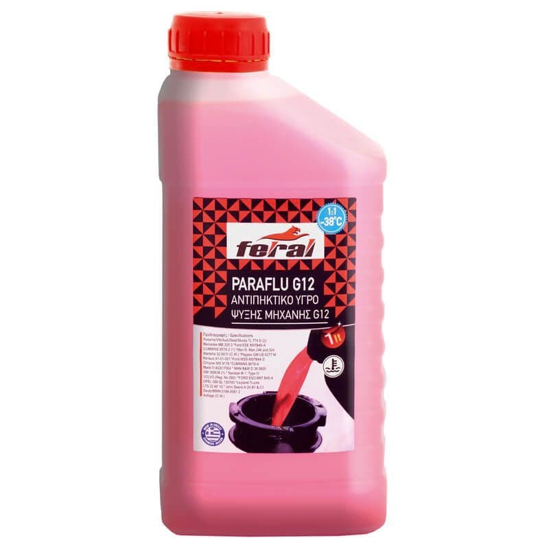 Το αντιψυκτικό G12 Feral είναι ένα προϊόν από συμπυκνωμένο υγρό κυκλώματος ψύξης ΜΕΚ, σύμφωνο με τις απαιτήσεις του BS 6580:2010 και είναι βασισμένο σε τεχνολογία ανόργανων οξέων (Inorganic Acid Technology). Η υψηλή ποιότητα αντιψυκτικού προστατεύει το κύκλωμα ψύξης του αυτοκινήτου όλο τον χρόνο. Παρέχει εξαιρετική προστασία κατά της διάβρωσης, της σκουριάς και της διάρρηξης, ενισχυμένη προστασία αντλίας και σωληνώσεων του συστήματος ψύξεως. Συνιστάται ειδικά για την προστασία των αλουμινένιων ψυγείων των σύγχρονων οχημάτων.
