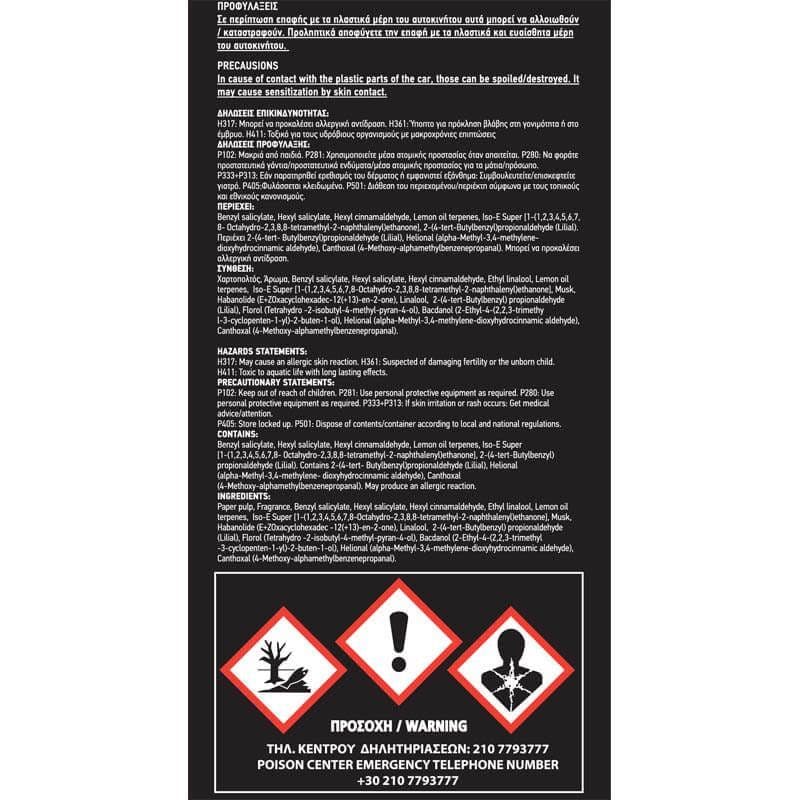 Οδηγίες: Ανοίξτε το φακελάκι από τις δύο εγκοπές στο πάνω μέρος. Για μεγαλύτερη διάρκεια τραβήξτε σταδιακά το αρωματικό χαρτόνι από το φακελάκι. Διαρκεί περισσότερο από (4) εβδομάδες. Προσοχή, να μην έρχονται σε επαφή με πλαστικά μέρη.