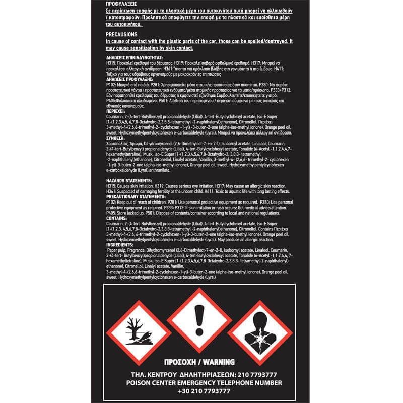 Οδηγίες: Ανοίξτε το φακελάκι από τις δύο εγκοπές στο πάνω μέρος. Για μεγαλύτερη διάρκεια τραβήξτε σταδιακά το αρωματικό χαρτόνι από το φακελάκι. Διαρκεί περισσότερο από (4) εβδομάδες. Προσοχή, να μην έρχονται σε επαφή με πλαστικά μέρη.