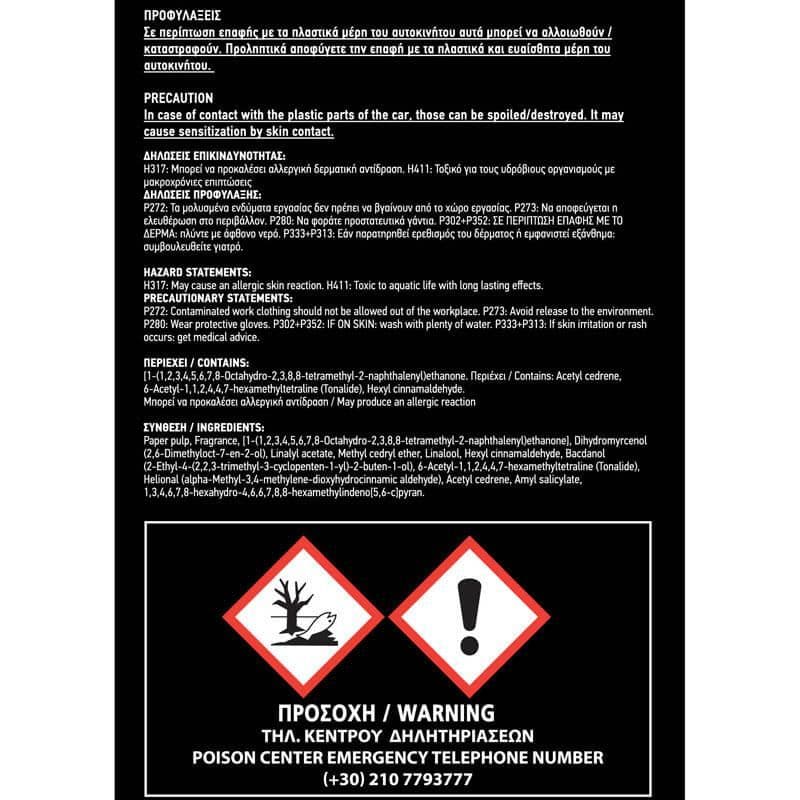 Οδηγίες: Ανοίξτε το φακελάκι από τις δύο εγκοπές στο πάνω μέρος. Για μεγαλύτερη διάρκεια τραβήξτε σταδιακά το αρωματικό χαρτόνι από το φακελάκι. Διαρκεί περισσότερο από (4) εβδομάδες. Προσοχή, να μην έρχονται σε επαφή με πλαστικά μέρη.