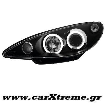 Φανάρι εμπρός μαύρο 2 Halo Rims για αυτοκίνητο Peugeot 206, για μοντέλο έτους 1998 έως 2007.