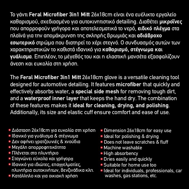 Το Γάντι Feral Microfiber 3 σε 1 Mitt Feral Detailing Pro 26x18cm είναι ευέλικτο εργαλείο καθαρισμού , σχεδιασμένο για αυτοκινητιστικό detailing.