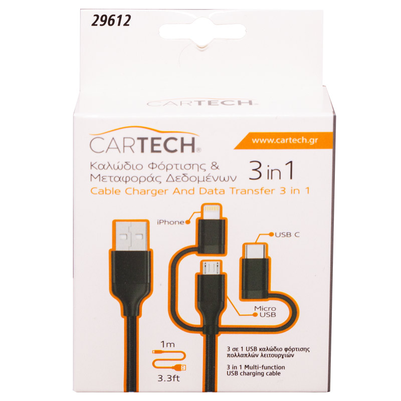 Καλώδιο Φόρτισης & Μεταφοράς Δεδομένων 3 σε 1 από την Cartech