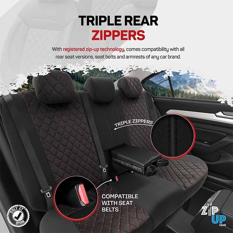 Zip-up Tech : Διαθέτει 3 Φερμουάρ ώστε να προσαρμόζεται στα πίσω καθίσματα είτε είναι διαιρούμενα 60-40 είτε 40-60 είτε 50-50.