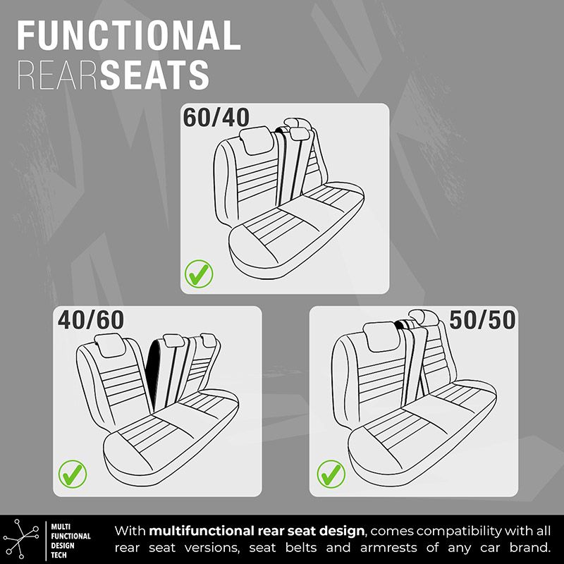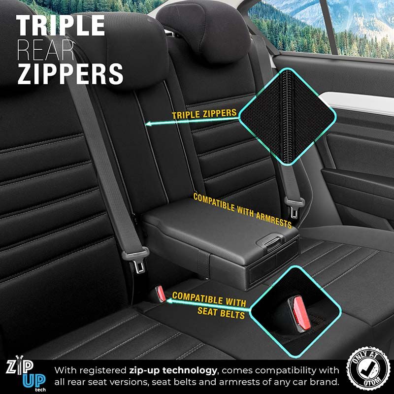 Zip-up Tech : Διαθέτει 3 Φερμουάρ ώστε να προσαρμόζεται στα πίσω καθίσματα είτε είναι διαιρούμενα 60-40 είτε 40-60 είτε 50-50.