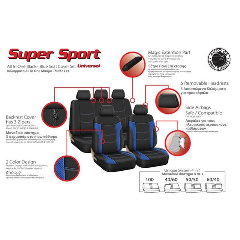 Καλύμματα Υφασμάτινα Super Sport All In One Μαύρο/Μπλε Σετ Εμπρός-Πίσω 11 Τεμάχια