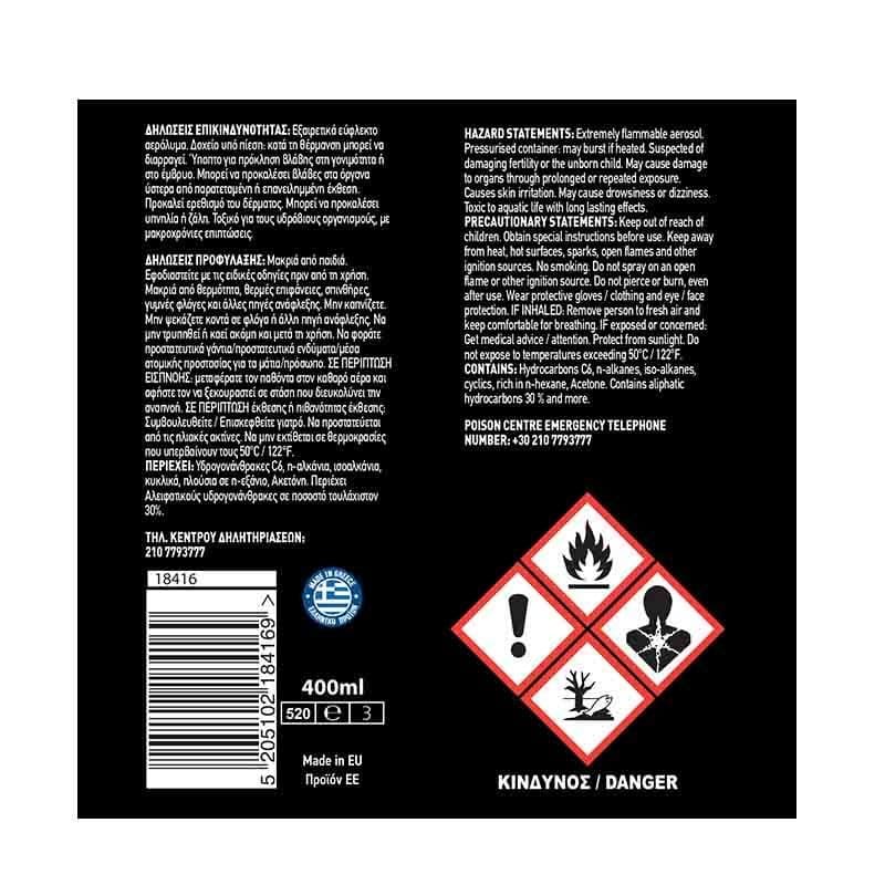 Σημείωση: Μην ψεκάσετε σε ζεστές / πυρωμένες επιφάνειες. Πριν τη χρήση σε πλαστικά και ελαστικά μέρη, δοκιμάστε το καθαριστικό σε επιφάνεια που δεν είναι ορατή.
