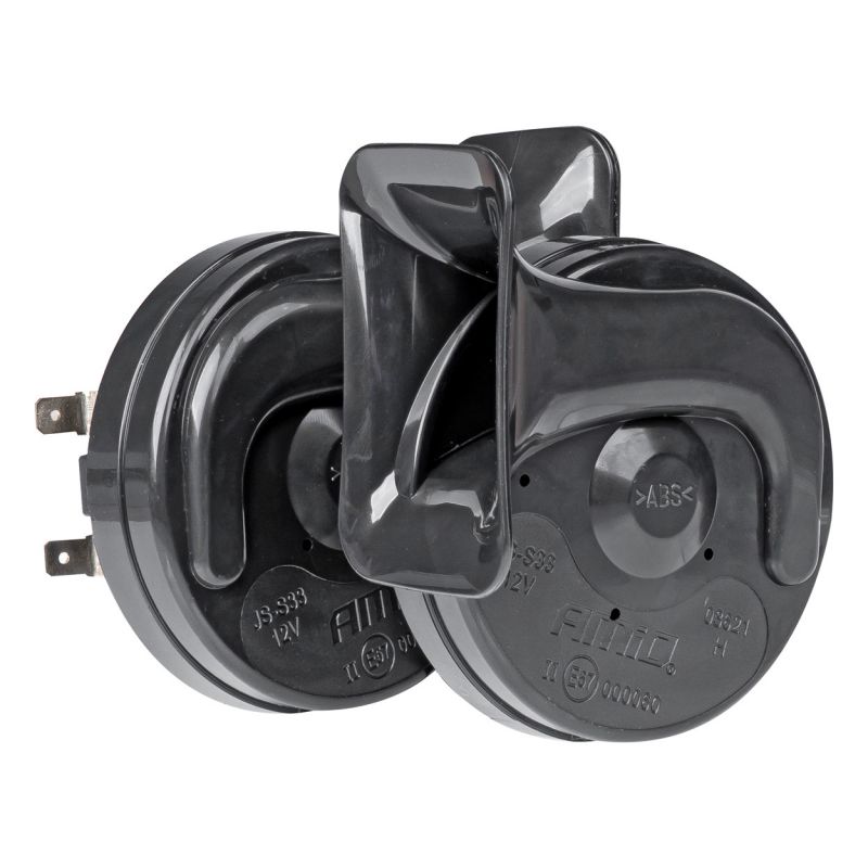 ΚΟΡΝΑ 12V 110db 2 ΤΟΝΩΝ 410Hz και 510Hz ΑΜΙΟ - 2 ΤΕΜ. Κόρνα 2 τόνων, από την εταιρεία ΑΜΙΟ, πολωνικής προέλευσης. Υψηλής ποιότητας, δυνατή (110 dB), που παράγει ήχους αποτελούμενους από δύο τόνους, με πλάκες στήριξης που περιλαμβάνονται. -Τάση τροφοδοσίας: 12V. -Ήχος : 410 Hz και 510 Hz. -Ένταση ήχου: 110 dB. Η κόρνα είναι universal, επομένως μπορεί να εγκατασταθεί σε οποιοδήποτε τύπο οχήματος με εγκατάσταση 12V.  Είναι επίσης κατάλληλο για τοποθέτηση σε οχήματα που δεν είναι εργοστασιακά εξοπλισμένα με κόρνα (π.χ. τετράτροχο, τρακτέρ κ.λπ.). Το προϊόν παράγει δυνατό ήχο με ισχύ 110 dB, που εξασφαλίζει αποτελεσματική προειδοποίηση των άλλων χρηστών του δρόμου σε διάφορες καταστάσεις.          Εξοπλισμένο με τα πιο συνηθισμένα βύσματα σύνδεσης, παρέχει απλή και βολική σύνδεση με το ηλεκτρικό σύστημα του οχήματος, εξαλείφοντας την ανάγκη για εξειδικευμένα εργαλεία. Συσκευασία 2 τεμαχίων