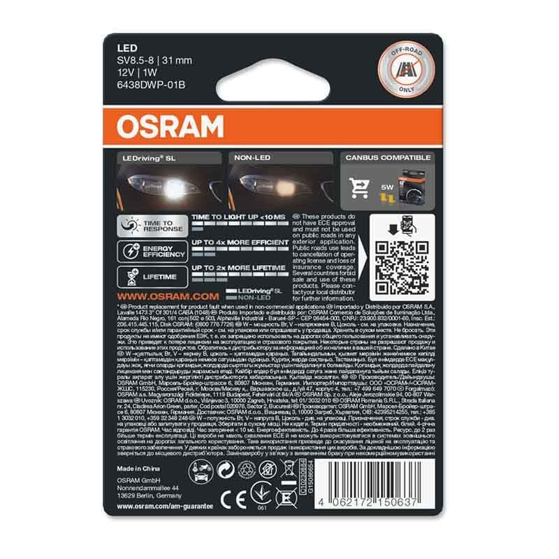 Λάμπα Led Σωληνωτή 31mm C5W SV8.5-8 12volt 1 watt 6000k Osram 6438DWΡ-01Β 1 Τεμάχιο