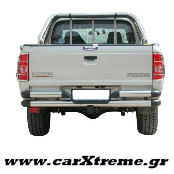 Οπίσθιος ανοξείδωτος προφυλακτήρας από σωλήνα Φ76, ενισχυμένες βάσεις βαρέως τύπου, με πάτημα εύκολης πρόσβασης και πλαϊνές τάπες από νάιλον και γυαλί, καθώς και με ειδική εσωτερική ενίσχυση του προφυλακτήρα με επιλογή αποσπώμενου συστήματος πρόσδεσης μεταβλητού ύψους της μπίλιας με βάση του ρυμούλκιου & extra επιλογής πύρου μπίλιας, για την μέγιστη οπίσθια προστασία (τοποθέτηση χωρίς τρυπήματα & συγκολλήσεις).