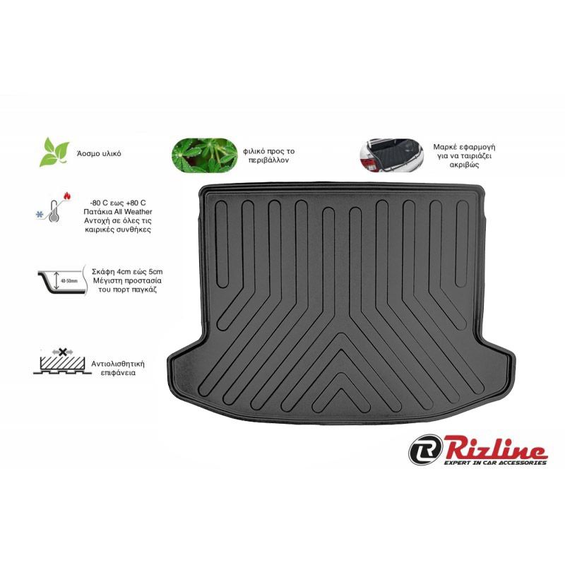 Τα υψηλής ποιότητας σκαφάκια πορτμπαγκάζ Rizline είναι κατασκευασμένα με τρόπο τέτοιο ώστε να προσαρμόζονται ακριβώς στο σχήμα του πορτ παγκάζ του αυτοκινήτου σας.Το υλικό κατασκευής τους είναι εξαιρετικά ανθεκτικό, TPE λάστιχο, υψηλής πυκνότητας. Είναι ισχυρότερο από τα αφρόδες υλικά (EVA material), υποαλλεργικό και εντελώς άοσμο που μπορεί να χρησιμοποιηθεί σε ευρύ φάσμα θερμοκρασιών από -50°C έως +80°C. Αδιάβροχα και ανθεκτικά σε λάδια και χημικά. Η κεντρική επένδυση είναι εύκολο να καθαριστεί από λάσπη, χιόνι, σκόνη, τρίχες κατοικίδιων, υγρά. Ιδανικά για επαγγελματική χρήση,εργασίες κήπου ή χρήση για την μετακίνηση του κατοικιδίου σας.Ο μοντέρνος σχεδιασμός εξασφαλίζει τη χρήση χωρίς προβλήματα.