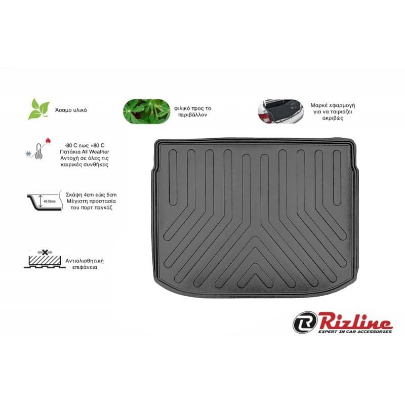 Τα υψηλής ποιότητας σκαφάκια πορτμπαγκάζ Rizline είναι κατασκευασμένα με τρόπο τέτοιο ώστε να προσαρμόζονται ακριβώς στο σχήμα του πορτ παγκάζ του αυτοκινήτου σας.Το υλικό κατασκευής τους είναι εξαιρετικά ανθεκτικό, TPE λάστιχο, υψηλής πυκνότητας. Είναι ισχυρότερο από τα αφρόδες υλικά (EVA material), υποαλλεργικό και εντελώς άοσμο που μπορεί να χρησιμοποιηθεί σε ευρύ φάσμα θερμοκρασιών από -50°C έως +80°C. Αδιάβροχα και ανθεκτικά σε λάδια και χημικά. Η κεντρική επένδυση είναι εύκολο να καθαριστεί από λάσπη, χιόνι, σκόνη, τρίχες κατοικίδιων, υγρά. Ιδανικά για επαγγελματική χρήση,εργασίες κήπου ή χρήση για την μετακίνηση του κατοικιδίου σας.Ο μοντέρνος σχεδιασμός εξασφαλίζει τη χρήση χωρίς προβλήματα.