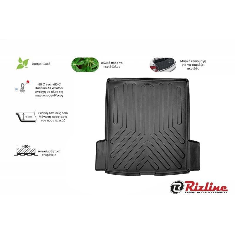 Τα υψηλής ποιότητας σκαφάκια πορτμπαγκάζ Rizline είναι κατασκευασμένα με τρόπο τέτοιο ώστε να προσαρμόζονται ακριβώς στο σχήμα του πορτ παγκάζ του αυτοκινήτου σας.Το υλικό κατασκευής τους είναι εξαιρετικά ανθεκτικό, TPE λάστιχο, υψηλής πυκνότητας. Είναι ισχυρότερο από τα αφρόδες υλικά (EVA material), υποαλλεργικό και εντελώς άοσμο που μπορεί να χρησιμοποιηθεί σε ευρύ φάσμα θερμοκρασιών από -50°C έως +80°C. Αδιάβροχα και ανθεκτικά σε λάδια και χημικά. Η κεντρική επένδυση είναι εύκολο να καθαριστεί από λάσπη, χιόνι, σκόνη, τρίχες κατοικίδιων, υγρά. Ιδανικά για επαγγελματική χρήση,εργασίες κήπου ή χρήση για την μετακίνηση του κατοικιδίου σας.Ο μοντέρνος σχεδιασμός εξασφαλίζει τη χρήση χωρίς προβλήματα.