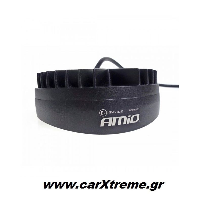 Προβολέας εργασίας από την AMIO, εξοπλισμένος με 9 led λευκού φωτισμού και μεταλλική βάση στήριξης, κατάλληλος για εξωτερική τοποθέτηση σε αμάξωμα αυτοκινήτου, SUV, φορτηγού, van ή τρακτέρ.