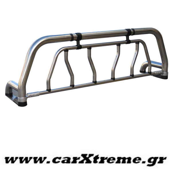 Roll bar ενάμιση σκέλους από ανοξείδωτο σωλήνα Φ65, διαιρούμενο για την τέλεια προσαρμογή στις διαστάσεις της εκάστοτε καρότσας, + χειροποίητη σωληνωτή ανοξείδωτη αψίδα Φ32,5, με ειδικά στηρίγματα τύπου σφυχτήτα στο πάνω και κάτω μέρος από ενισχυμένο ντουραλουμίνιο, όπου δεν περιορίζει την ορατότητα & ευκολότερο καθαρισμό του πίσω παραθύρου του οχήματος, καθώς επίσης τηρεί τα στάνταρ προστασίας και ποιότητας των επιβατών σε περίπτωση επαφής τους με αυτήν (0% αιχμηρότητα). RB 406 INOX + APS 0952 INOX
