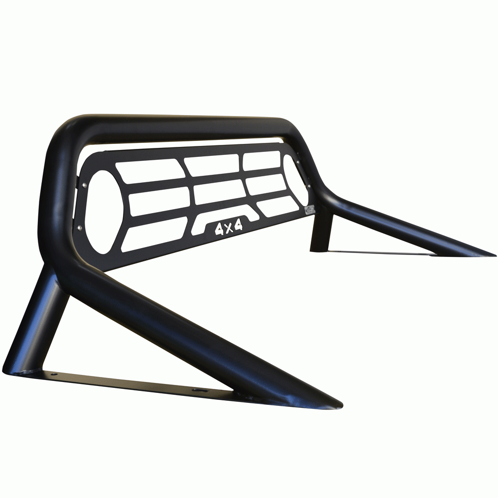 Roll-Bar σύγχρονο, σε ματ μαύρο χρώμα, σιδερένιο, μονοκόμματο, ενάμιση σκέλους, εργοστασιακού τύπου σχεδίαση, με επίπεδη ματ μαύρη αψίδα (προστατευτικό) τζαμιού