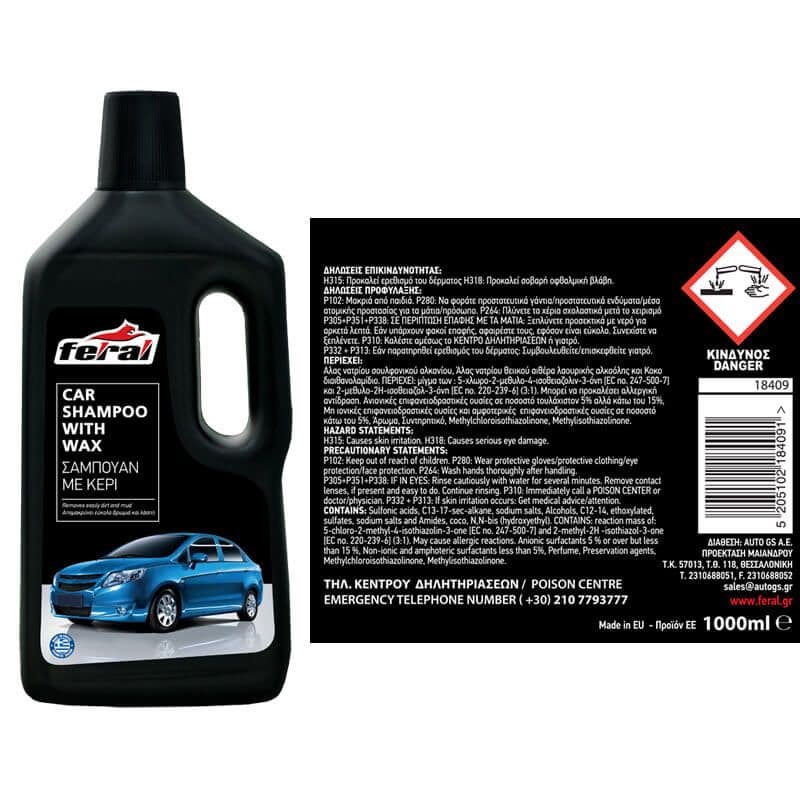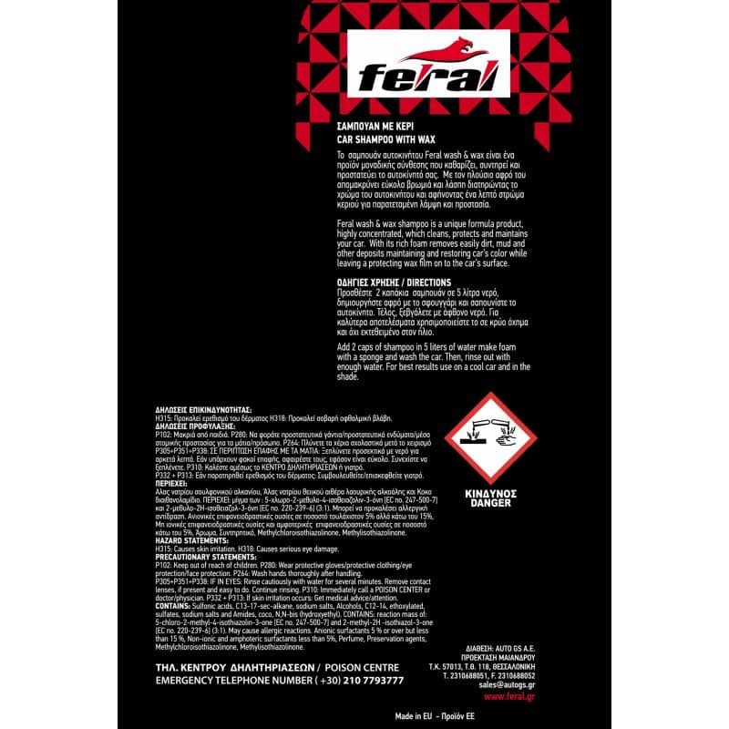 To σαμπουάν με κερί Feral είναι ένα προϊόν με μοναδική σύνθεση που καθαρίζει, συντηρεί και προστατεύει το αυτοκίνητό σας. Με τον πλούσιο αφρό του, απομακρύνει εύκολα βρωμιά και λάσπη, διατηρώντας το χρώμα του αυτοκινήτου και αφήνοντας ένα λεπτό στρώμα κεριού για παρατεταμένη λάμψη και προστασία.Ξεπλένεται εύκολα, αφήνοντας καθαρή επιφάνεια και προσφέροντας προστασία από τη σκόνη, τον ήλιο και τη βροχή.