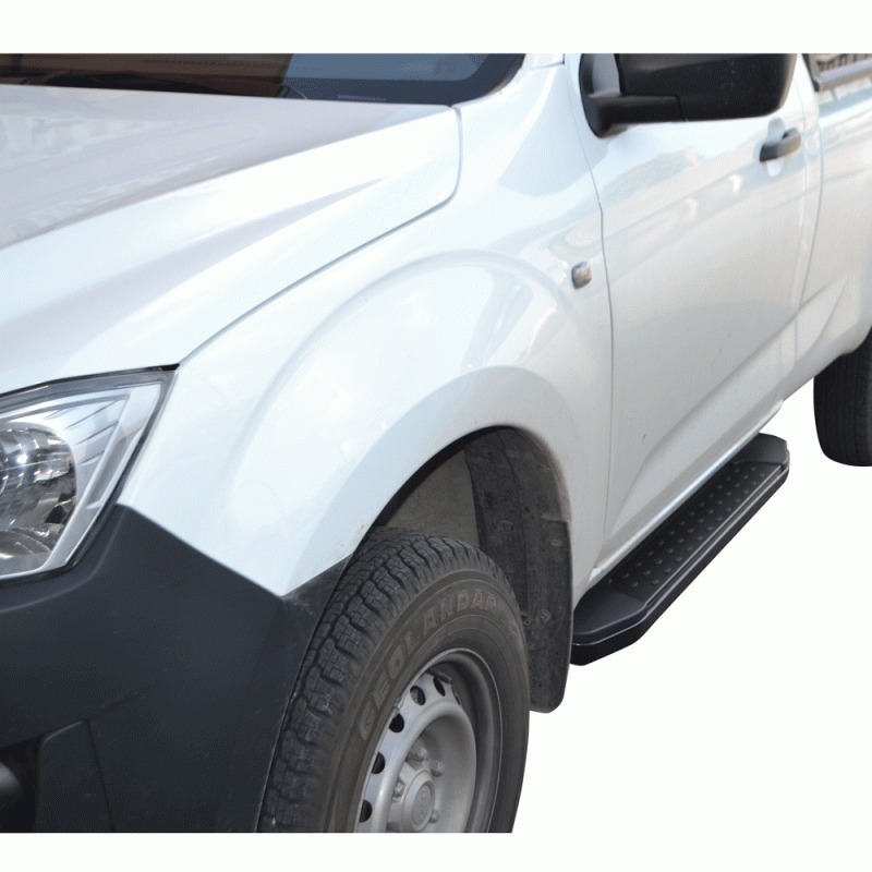 Σκαλοπάτια Premium πλατιά αλουμινίου πιτσιλωτά, σε ματ μαύρο χρώμα, βαρέως τύπου, με αντιολισθητικό πάτημα για την εύκολη πρόσβαση στην καμπίνα των επιβατών καθώς και την πλαϊνή παθητική ασφάλεια του αυτοκινήτου
